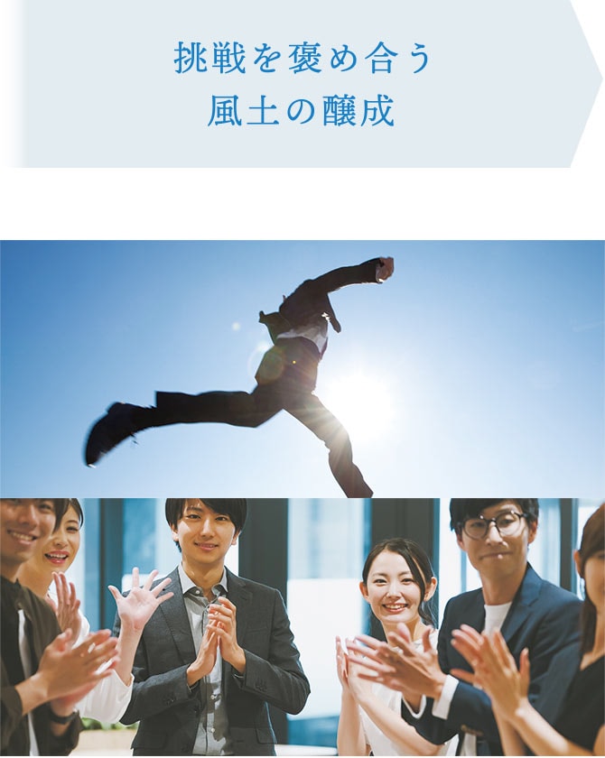 「イキイキ・ワクワクビジョン 2030」を実現するには「新しいことに挑戦し、失敗してもいいから、まずは一歩踏み出し、今を変えていく」ことが不可欠です。挑戦の先には必ず成功と失敗があります。たとえ失敗に終わったとしても、それを含めて「挑戦を褒め合う」ことができれば、次の「挑戦」が生まれやすくなり、それが新たな価値創出への近道となります。企業を取り巻く環境は非常に速いスピードで変化しています。社員一人ひとりが「現状維持は後退である」という認識を持ち、「挑戦する風土」から一歩進んだ「挑戦を褒め合う風土」を醸成していきます。