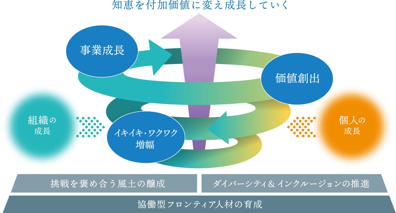 挑戦を褒め合う風土の醸成やダイバーシティ&インクルージョンの推進を通じて、社員個人と会社が共に成長し続ける事で、世界中のお客様や社会への新たな提供価値を創出していきます。