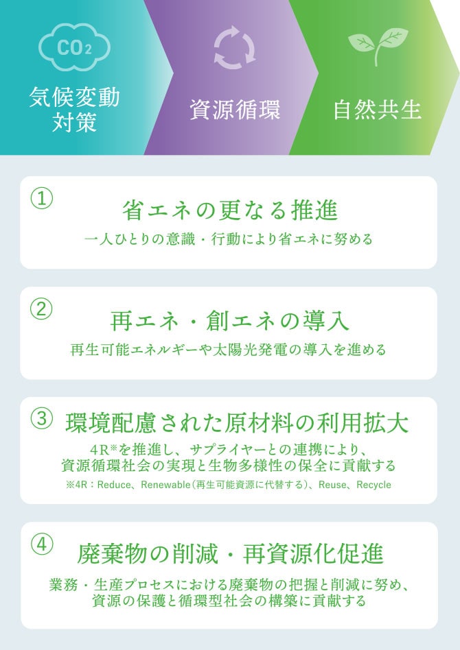 私たちはこれまでも、グループ企業理念や環境宣言・環境方針に沿って、事業活動を通じた環境負荷低減に寄与してきました。一人ひとりがコツコツ真面目に誠実な活動を貫き、少しずつ活動の輪を広げてきました。しかしながら、ますます深刻化する気候変動や資源の枯渇、生物多様性の損失といった世界の現状を鑑み、私たちがさらに注力すべき重要課題として「気候変動対策・資源循環・自然共生」の3つを掲げました。今後はこれまで以上に、全従業員が高い意識と責任感をもって、上記に取り組んでいきます。